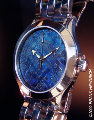 Dial: Frank Heydrich's own process for BLUE METEORITE™, made from Arizona's own Meteor Crater (see wikipedia Canyon Diablo Meteorite)