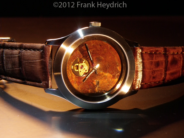 I rebuilt this watch recently and it is now for sale I added a heat treated golden brown steel chapter ring which gives the watch an elegant look. This watch has a skeleton movement and since it does not have a seconds hand I opened a window in the dial so you can see if the movement is breathing.