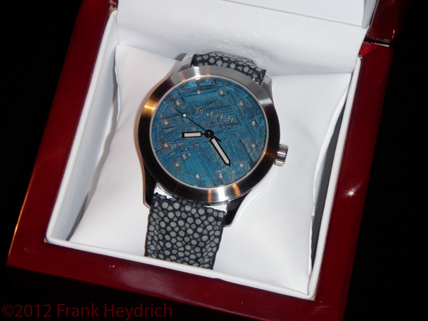 The Muonionalusta, like other nickel-iron meteorites is part of a Type-M asteroid and is over 4.5 Billion years old (older than earth). It has been on earth longer than others since it impacted nearly 1 million years ago. It is classified as a fine octahedrite, type IVA. The first fragment of the Muonionalusta was found in 1906 approximately 87 mi north of the Arctic Circle, in Norrbotten, Sweden. Around forty pieces are known today. This meteorite has been patiently waiting through four ice ages in order to be discovered and recycled into this new timepiece.