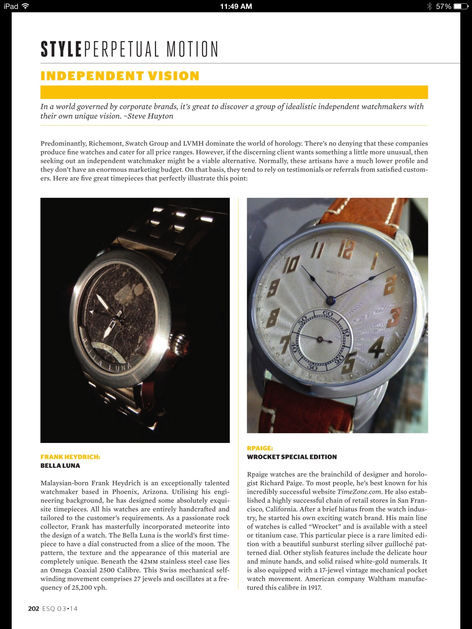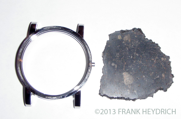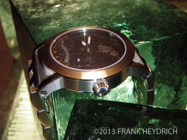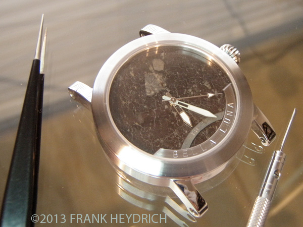 I believe this is the first watch made with a full slice of the moon as the dial. There was a prior one of a kind watch that used 2 tiny dots of the moon in the moonphase display, if you are curious what an $860,000 watch looks like, google the Louis Moinet Magistralis. This watch uses a full slice of the moon to span the entire dial and it is made from lunar meteorite NWA 6355. It is classified as a Lunar Melt-Matrix Minglet Breccia. A single complete stone of 760 grams was found in 2009 in Morocco. Less than half of it is publicly available. A clast-laden vitric breccia consisting of fine-grained mineral debris (pyroxene, olivine, anorthite) and sparse polycrystalline igneous clasts in a heterogeneous, "swirtly" glass matrix. There is a close similarity in bulk chemical composition between this lunar rock and Apollo 16 soils. This is one of the only instances where lunar meteorites can be correlated with materials at a specific landing site on the Moon. It was a humbling experience to hold a piece of the moon in your hands. "Bella Luna" is the second completely custom watch commissioned by Mr. Martin. It was also my privelage to construct a Martian Meteorite watch for him (see number 33 "Mars Aerolite").