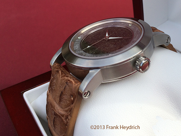 This is a bespoke watch made for Michael Hamlet aka "Bones" (flew F-4 Phantoms) who had previously purchased number 51. He named it Planum Australe for the southern polar region of Mars. This region of Mars was intended to be explored by a probe in 1999 but it was lost during landing. The Mars Polar Lander's demise apparently occurred when the lander thought the jolt of its landing leg deployment was touchdown - and shut its engines off prematurely. Moments later it crashed into Mars.