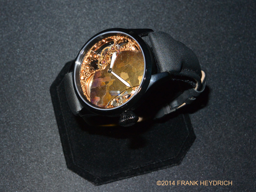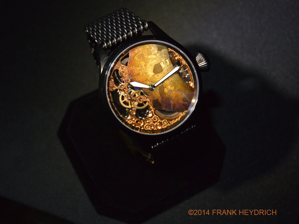 Dial: Made from the Campo Del Cielo Meteorite (Argentina see wikipedia), Gold treated color, natural crust and ablated re-entry surface of the meteorite left intact