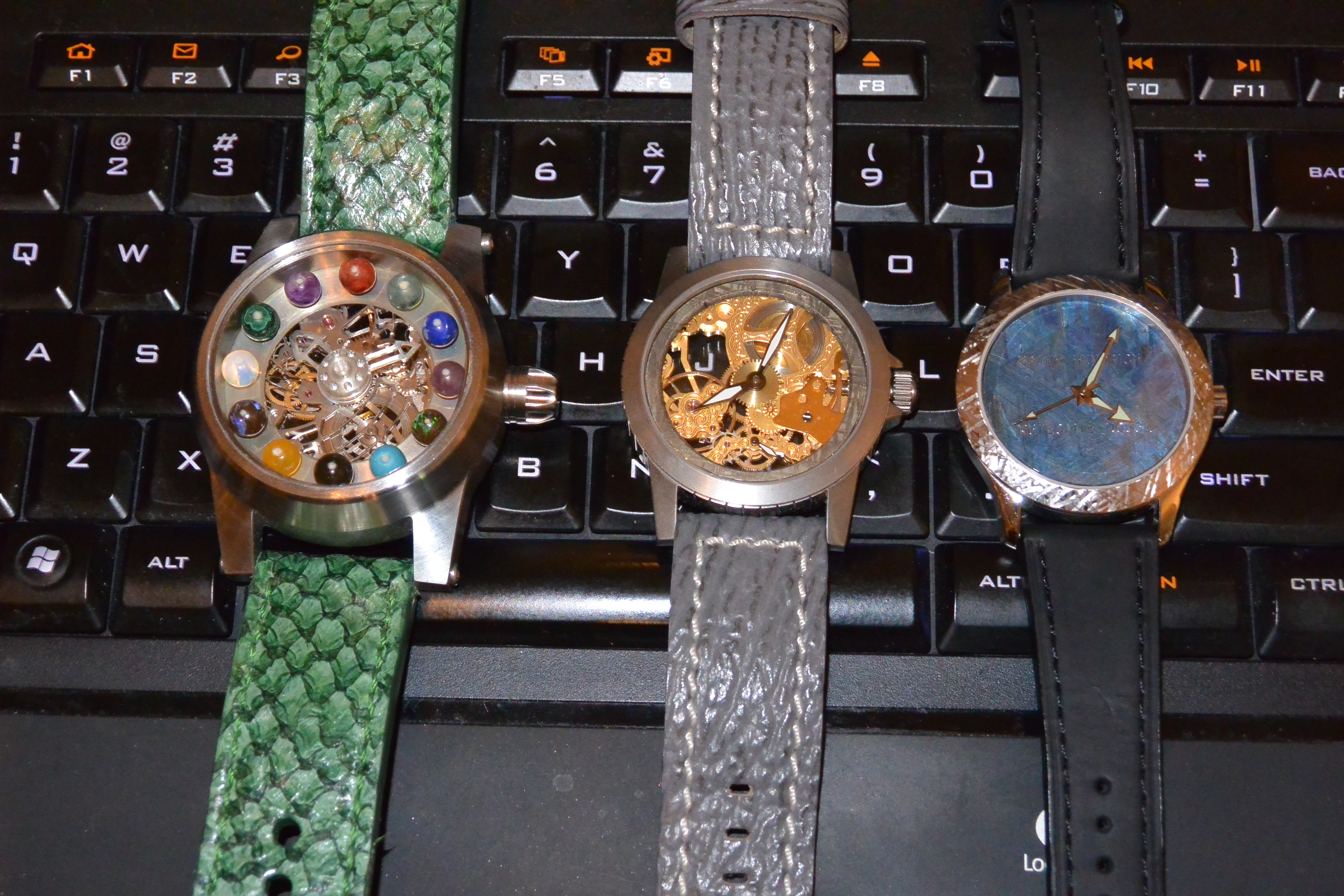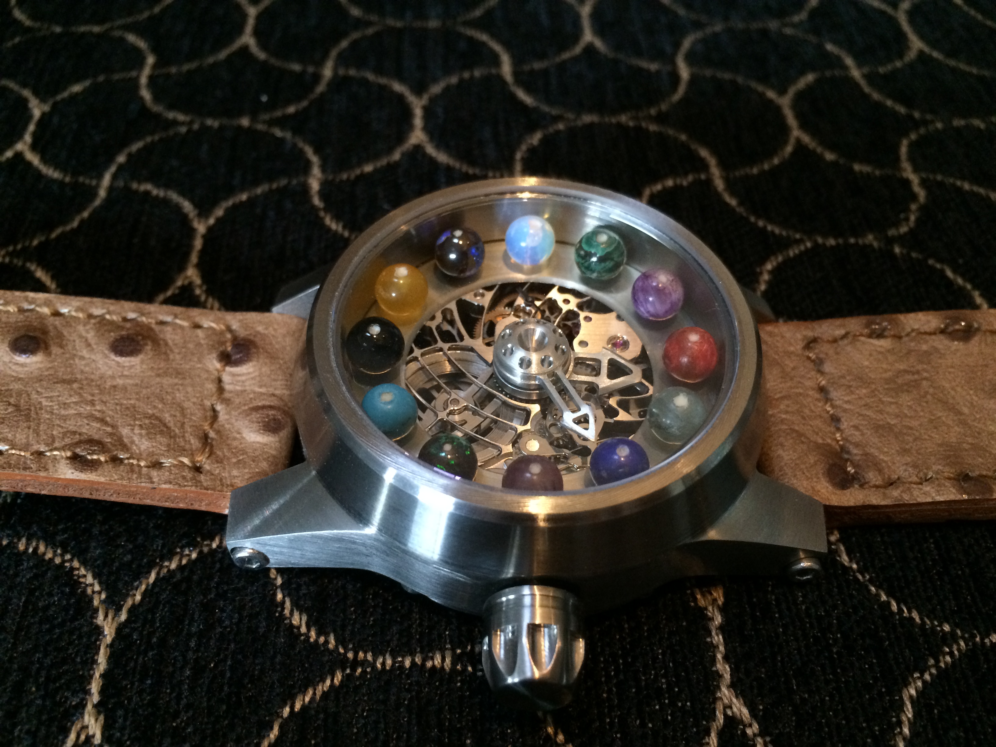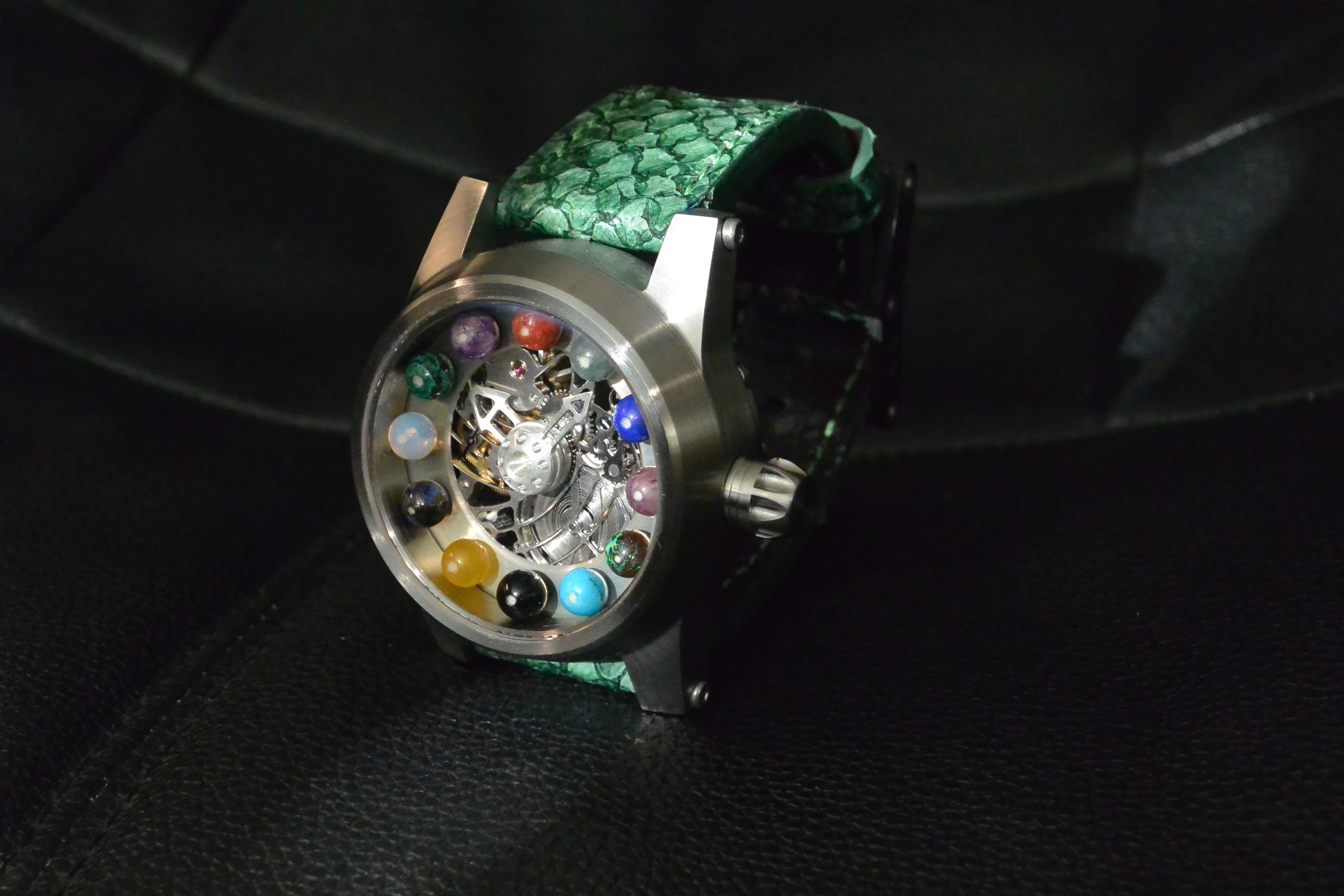 After hundreds of hours of work, the watch was completed with only 10 minutes to spare for the last possible FEDEX shipment. This watch is destined for a small but exclusive production run of very limited quantities. The gemstone selection will allow for infinite bespoke personalization so the customers, can have any gem or color combination that has meaning for them including diamonds/rubies/sapphires/etc. in custom color configurations. The watch is oversized so it will be best for those who have larger wrists or do not mind the obvious attention that this watch commands.