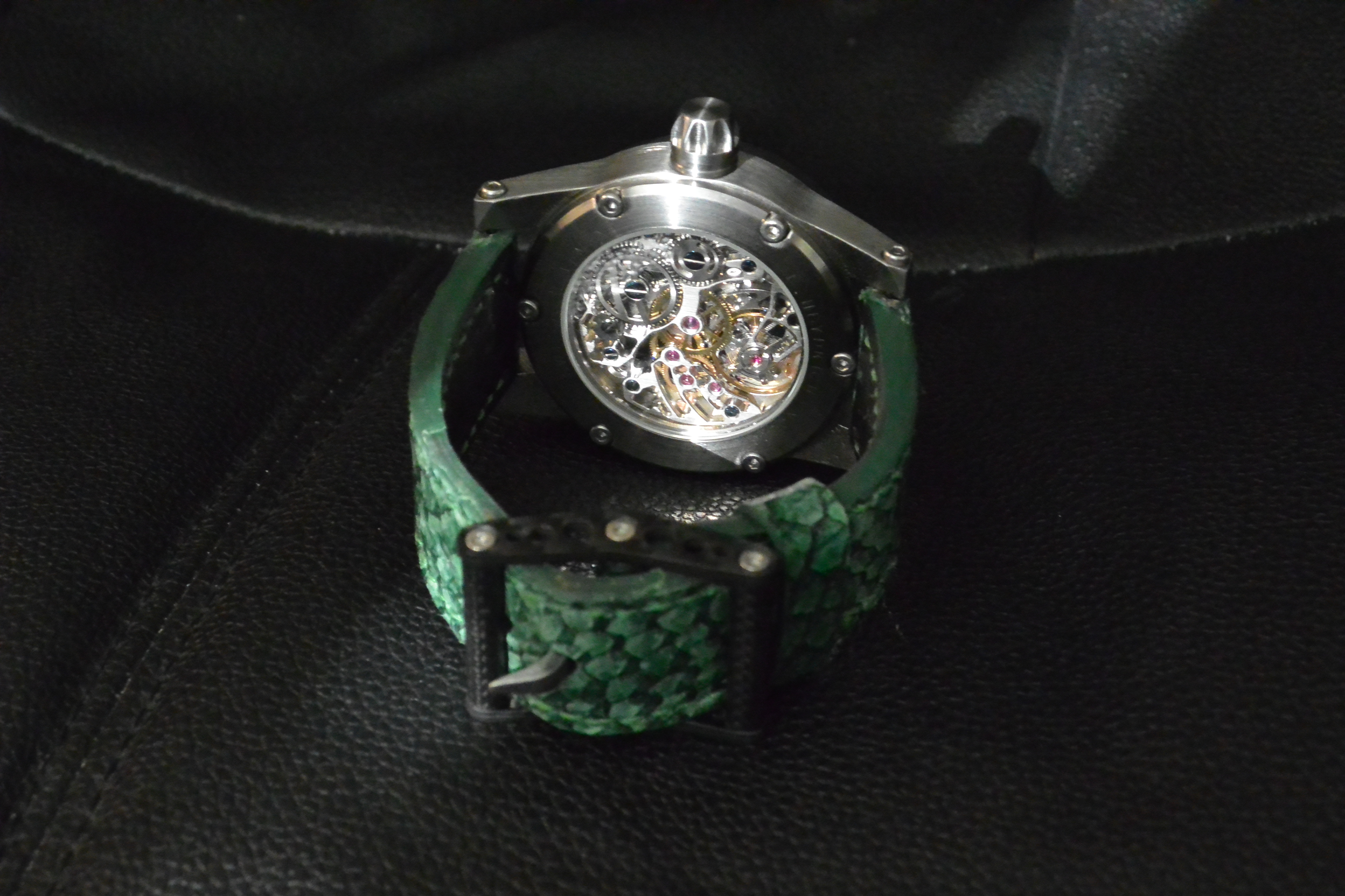 | Custom German made carbon fiber and damasus steel buckle | Rear view through the display back |