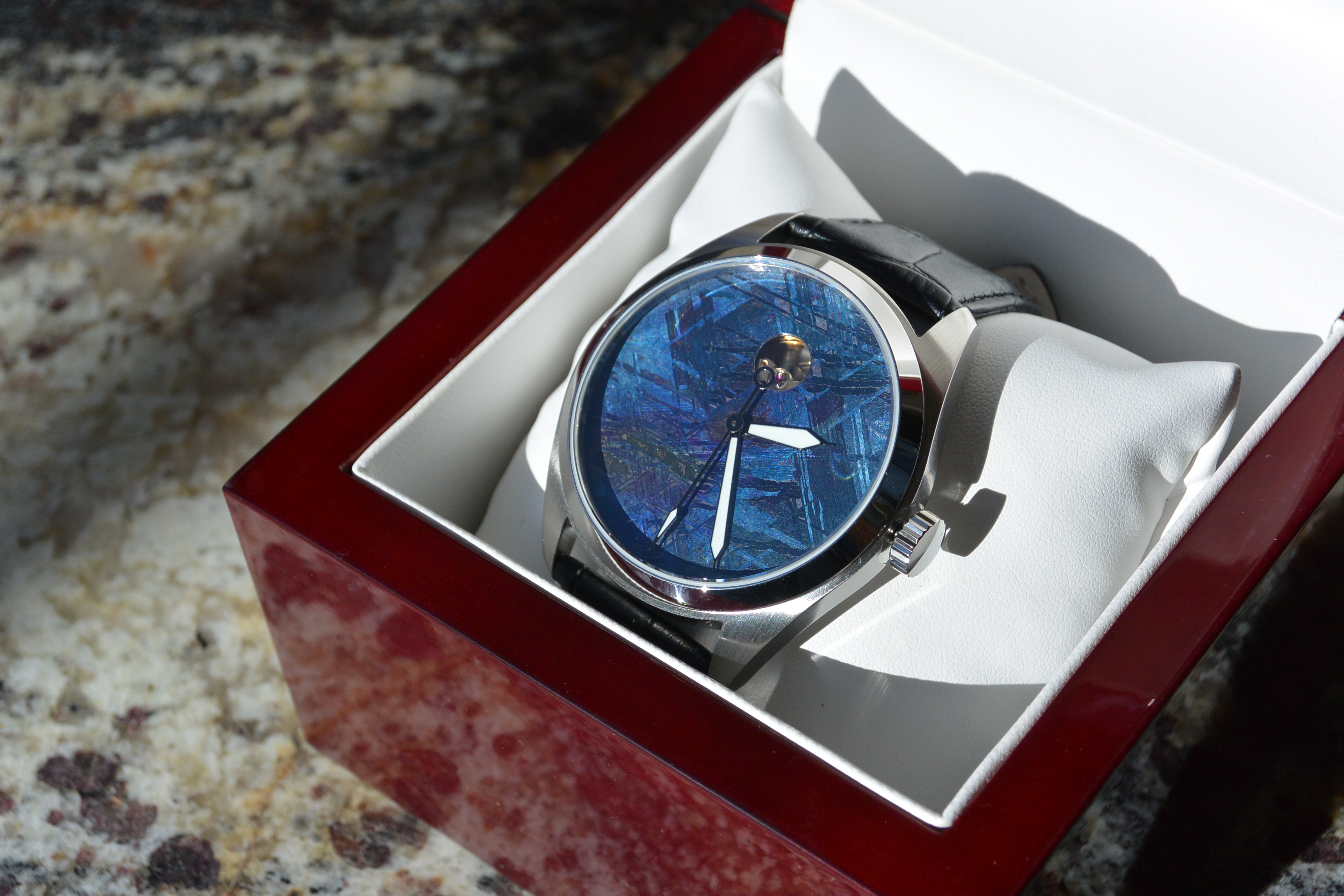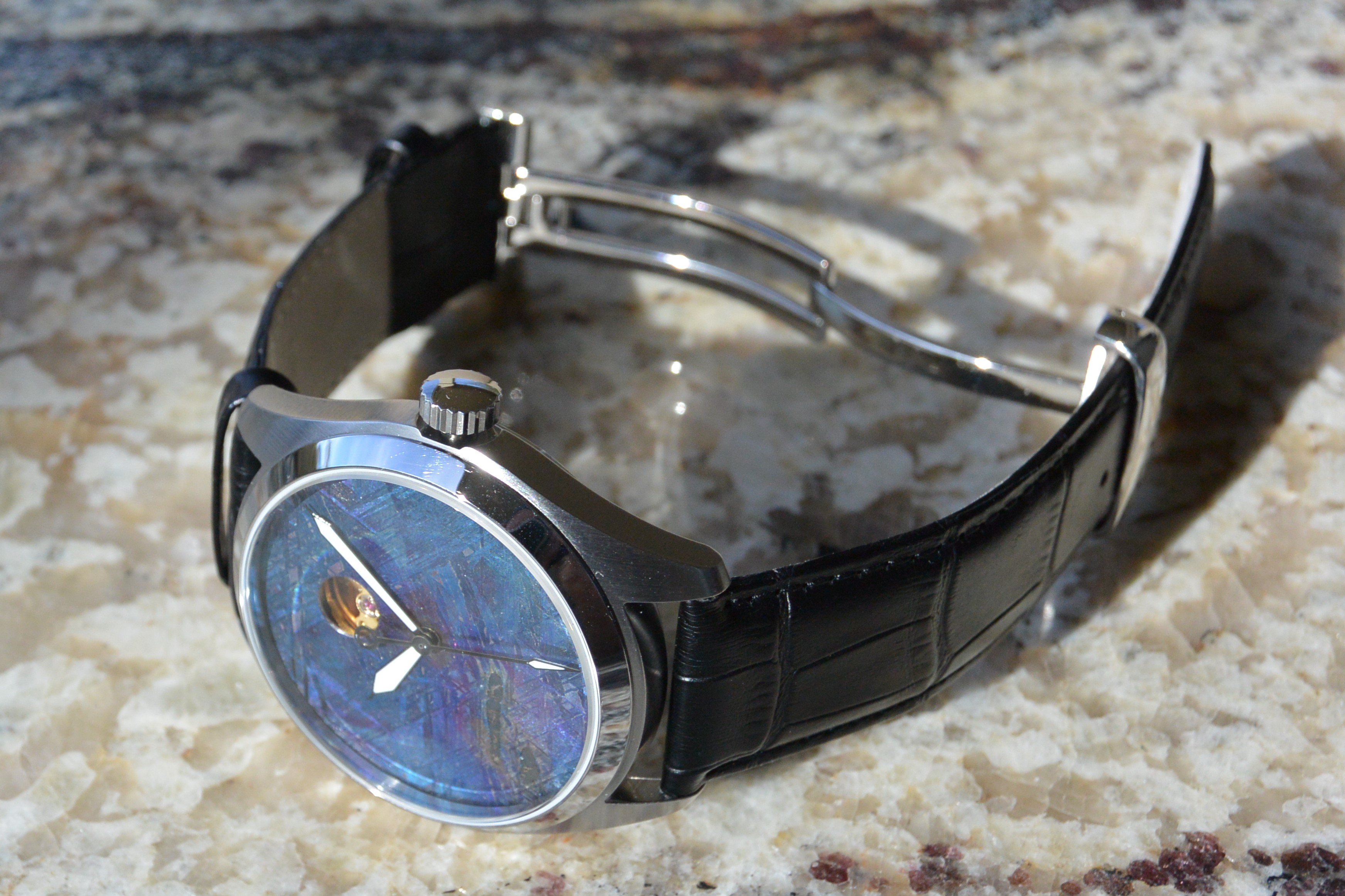 Dial: Gibeon Meteorite blue heat treat with open cutout