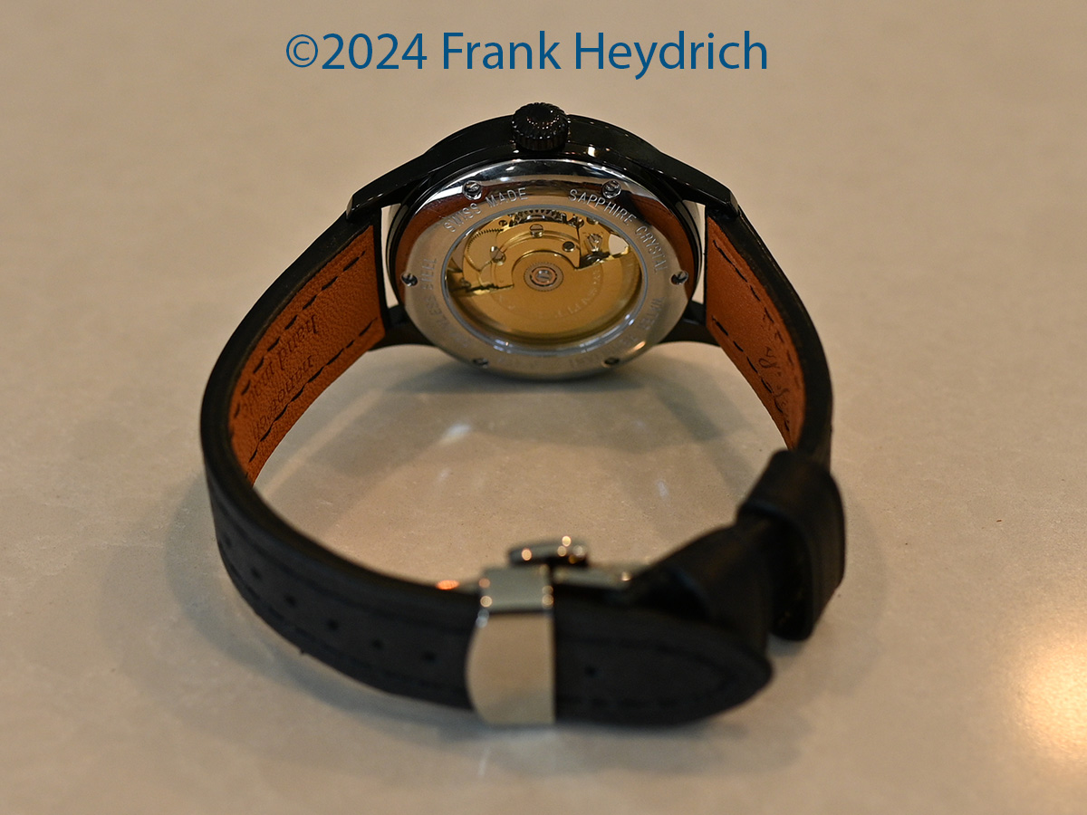 Movement: Swiss SW200 automatic movement, 26 jewels, modified to expose the "beating heart" balance wheel