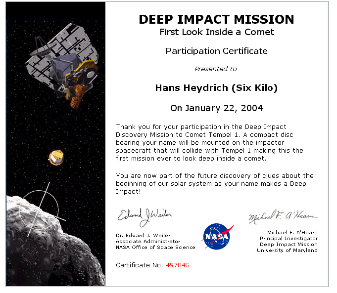 Listed below is the NASA homepage for this project which is very interesting but you have to dig around for the good stuff. It has some animations and some footage I saw a few years back showing test impacts at 6 miles per second into pumice dust. If you are reading this before Jan 31, 2004 you can get listed on the mission as well.