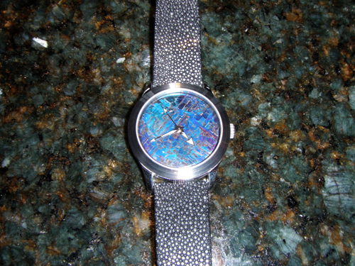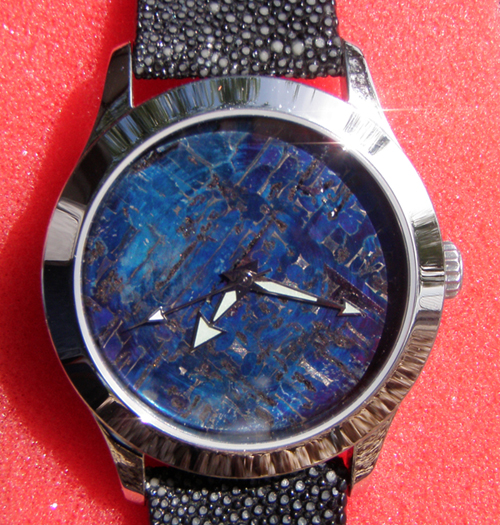 Dial: Frank Heydrich's own process for BLUE METEORITE™, made from Arizona's own Meteor Crater (see wikipedia Canyon Diablo Meteorite)
