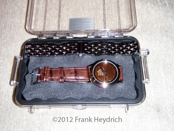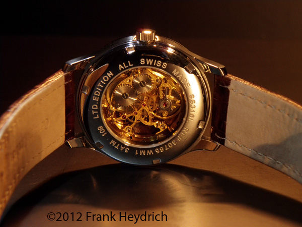 I rebuilt this watch recently and it is now for sale I added a heat treated golden brown steel chapter ring which gives the watch an elegant look. This watch has a skeleton movement and since it does not have a seconds hand I opened a window in the dial so you can see if the movement is breathing.