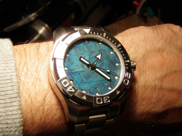 Dial: Gibeon Meteorite, Blue, machined markers with White lume