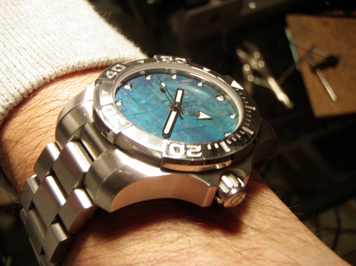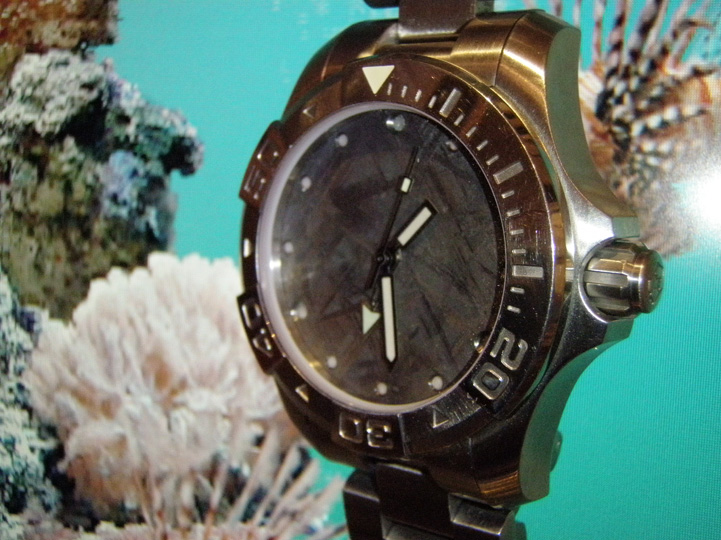 ™ Model Series: Custom upgrade of a Swiss dive watch to a meteorite automatic GMT. I converted this from a quartz watch because I liked the case and I wanted a bulletproof diver with one of my dials. It is not for sale but shown as an example of customization that is possible.