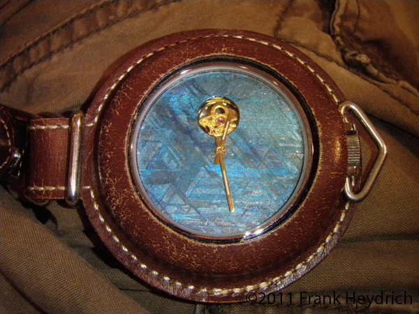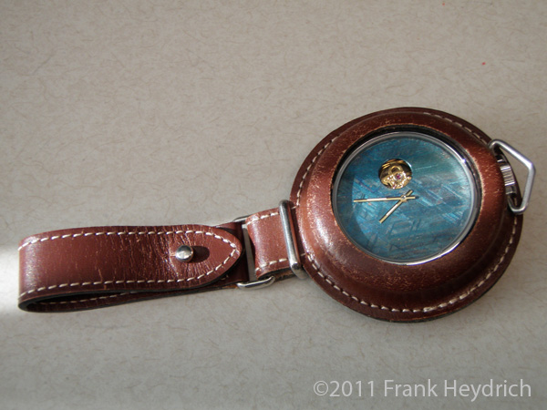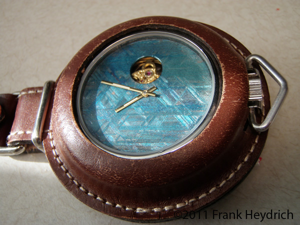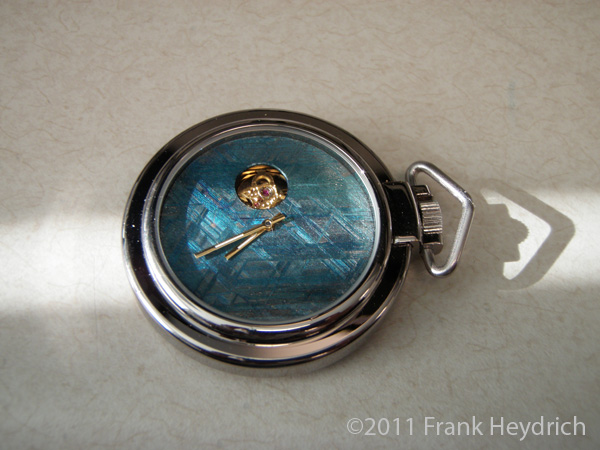 I was asked to convert a plain modern pocket watch with a quartz movement into something with one of my blue meteorites and a mechanical movement. I also cut a display window in the back so the beautiful skeleton movement can be seen.