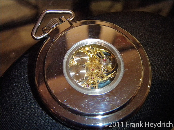 This skeletonized movement can be seen beating through the open heart. You can also see when the spring is fully wound and all the gears are visible from the display back.