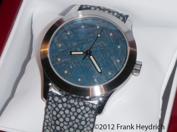 The Muonionalusta, like other nickel-iron meteorites is part of a Type-M asteroid and is over 4.5 Billion years old (older than earth). It has been on earth longer than others since it impacted nearly 1 million years ago. It is classified as a fine octahedrite, type IVA. The first fragment of the Muonionalusta was found in 1906 approximately 87 mi north of the Arctic Circle, in Norrbotten, Sweden. Around forty pieces are known today. This meteorite has been patiently waiting through four ice ages in order to be discovered and recycled into this new timepiece.