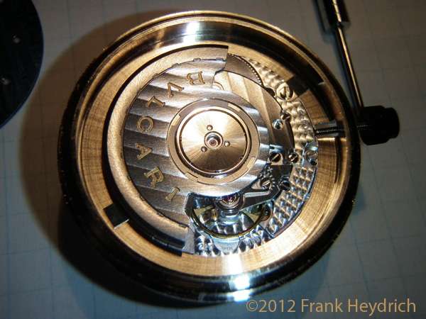 Movement: Bulgari 220 MBB automatic 21 Jewel Swiss movement with hour, minute, sweep seconds, 42hr power reserve, frequency 28,800 beats per hour