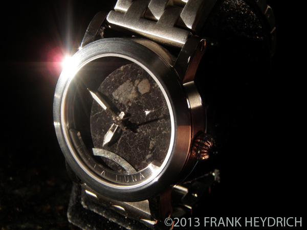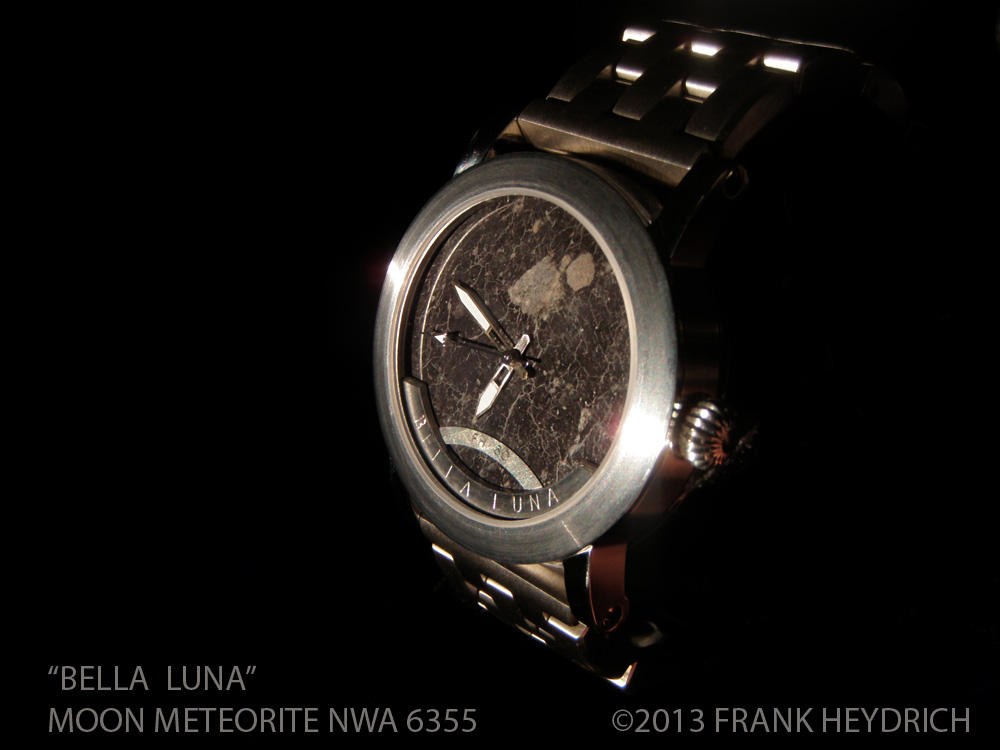 I believe this is the first watch made with a full slice of the moon as the dial. There was a prior one of a kind watch that used 2 tiny dots of the moon in the moonphase display, if you are curious what an $860,000 watch looks like, google the Louis Moinet Magistralis. This watch uses a full slice of the moon to span the entire dial and it is made from lunar meteorite NWA 6355. It is classified as a Lunar Melt-Matrix Minglet Breccia. A single complete stone of 760 grams was found in 2009 in Morocco. Less than half of it is publicly available. A clast-laden vitric breccia consisting of fine-grained mineral debris (pyroxene, olivine, anorthite) and sparse polycrystalline igneous clasts in a heterogeneous, "swirtly" glass matrix. There is a close similarity in bulk chemical composition between this lunar rock and Apollo 16 soils. This is one of the only instances where lunar meteorites can be correlated with materials at a specific landing site on the Moon. It was a humbling experience to hold a piece of the moon in your hands. "Bella Luna" is the second completely custom watch commissioned by Mr. Martin. It was also my privelage to construct a Martian Meteorite watch for him (see number 33 "Mars Aerolite").