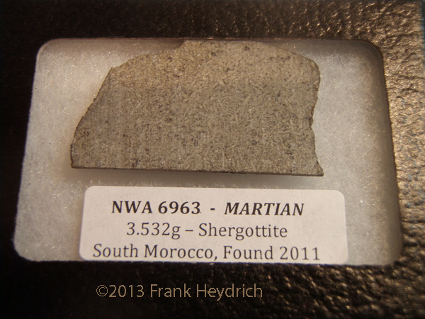 This is made from a piece of the Mars Meteorite known as NWA6963 which was found in Morocco in 2011. The detailed meteoritical bulletin information on this particular meteorite can be found here: