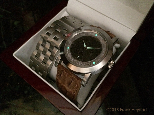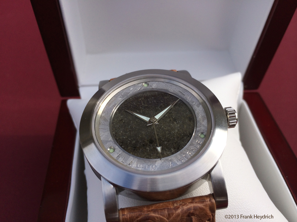 This is a bespoke watch made for Michael Hamlet aka "Bones" (flew F-4 Phantoms) who had previously purchased number 51. He named it Planum Australe for the southern polar region of Mars. This region of Mars was intended to be explored by a probe in 1999 but it was lost during landing. The Mars Polar Lander's demise apparently occurred when the lander thought the jolt of its landing leg deployment was touchdown - and shut its engines off prematurely. Moments later it crashed into Mars.
