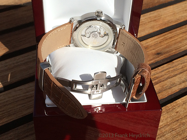 Retention: Hornback Crocodile leather with a double deployment clasp as the primary band, with an alternate ss bracelet with double deployant clasp