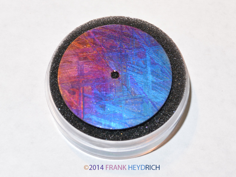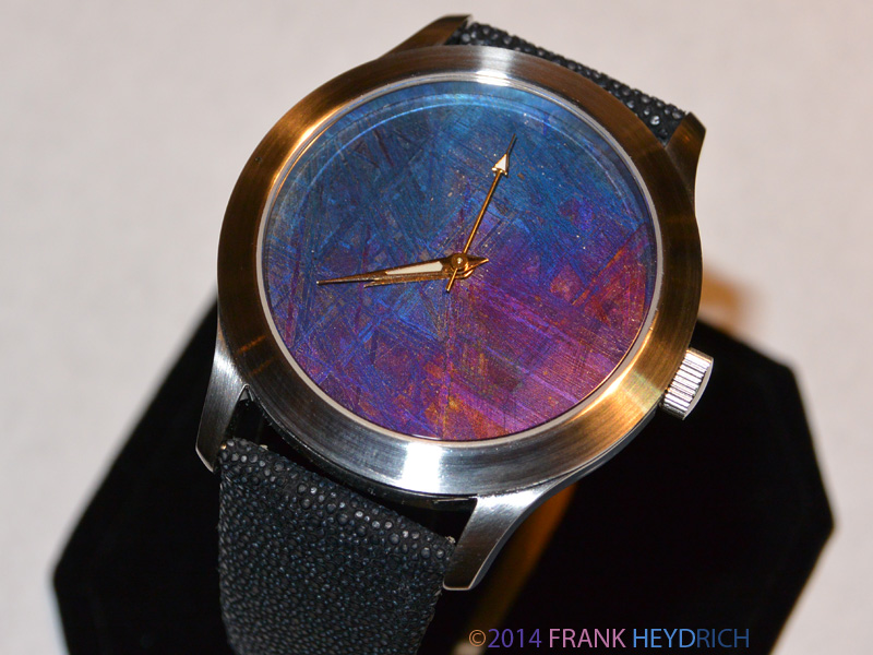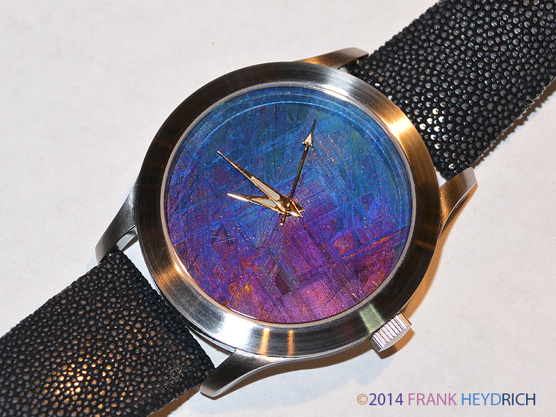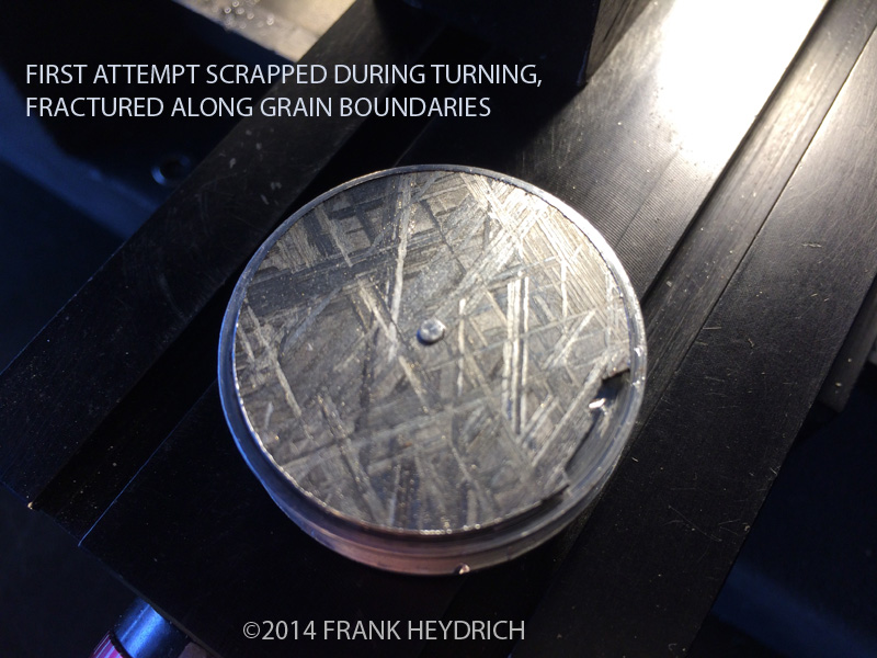 The first attempt ended in a failure as the dial cracked along the weak grain boundaries. I am glad this happened because the replacement meteorite turned out to have beautiful colors as I wanted both blue and purple in a nice dichroic display.