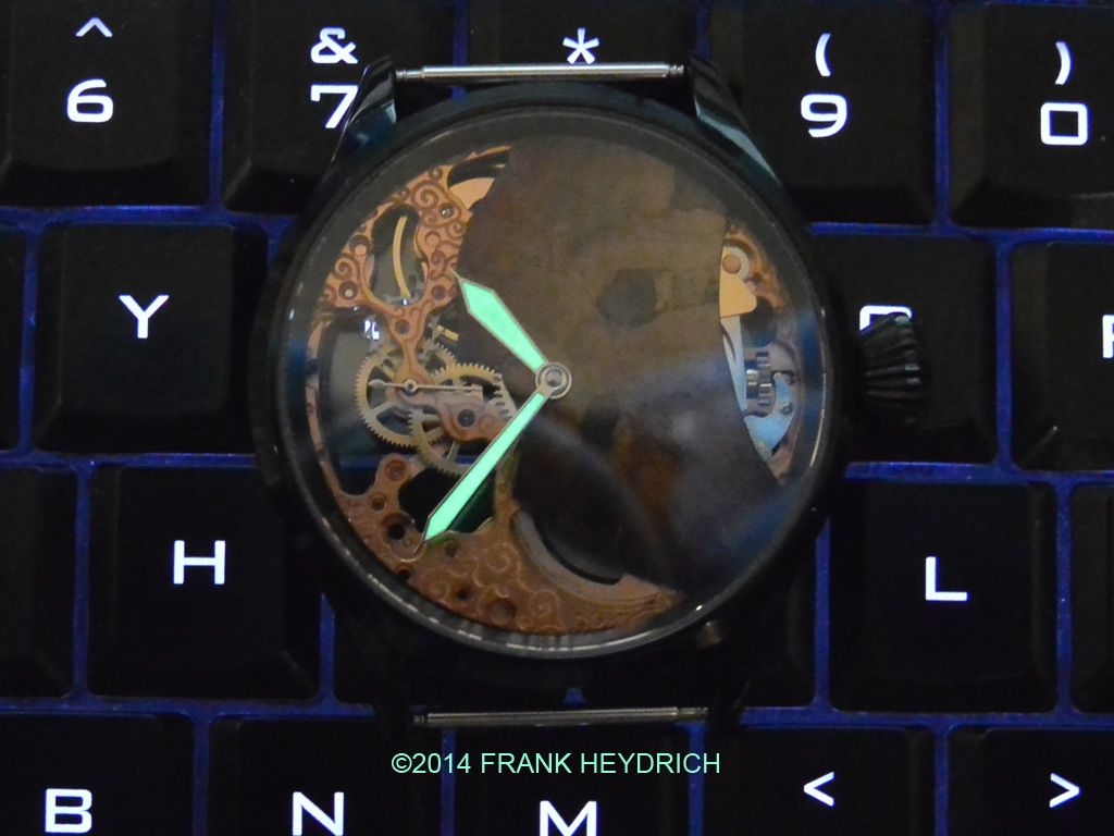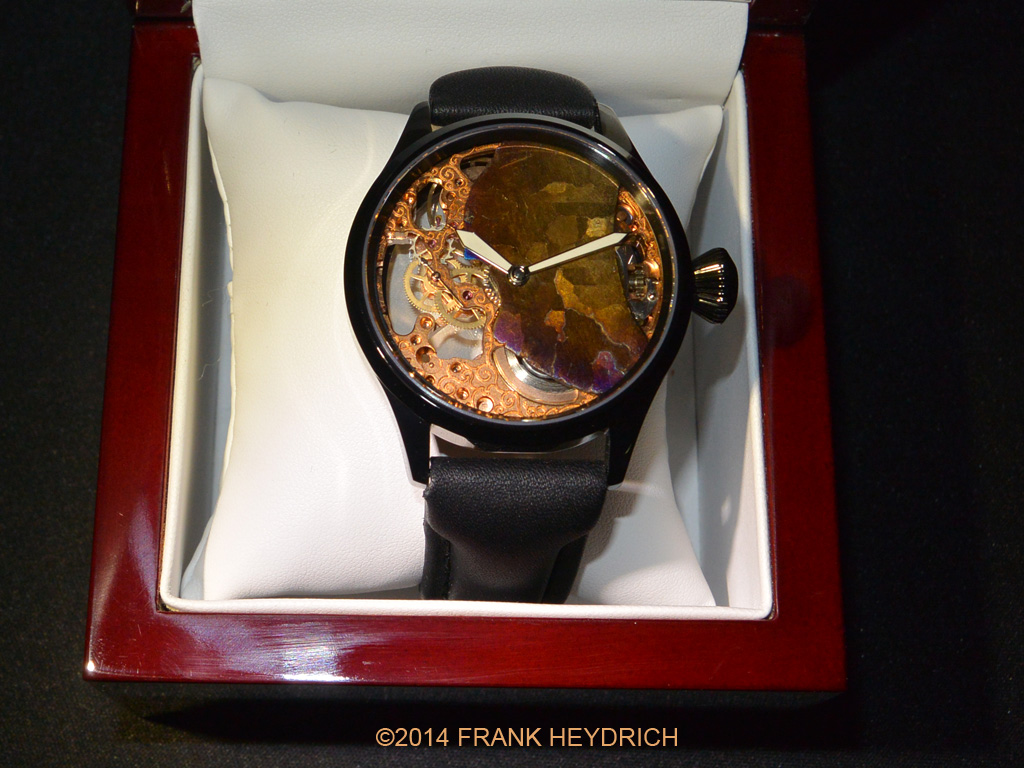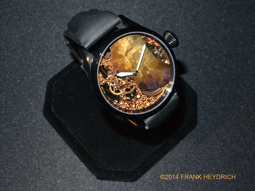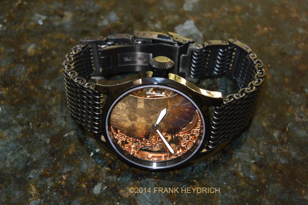 Dial: Made from the Campo Del Cielo Meteorite (Argentina see wikipedia), Gold treated color, natural crust and ablated re-entry surface of the meteorite left intact