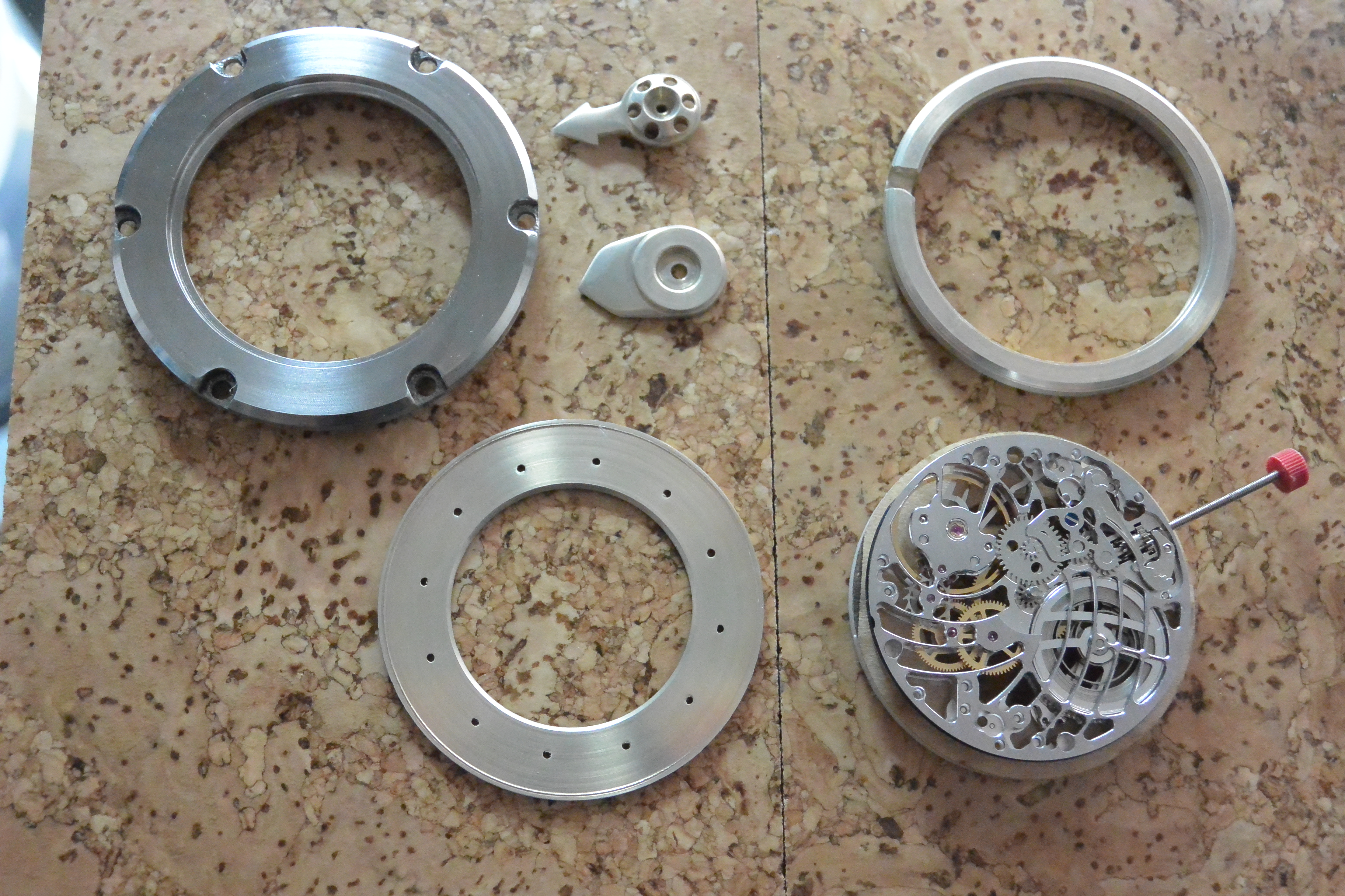 | Finishing the titanium case on my lathe at home | The titanium back and the preliminary hands |
