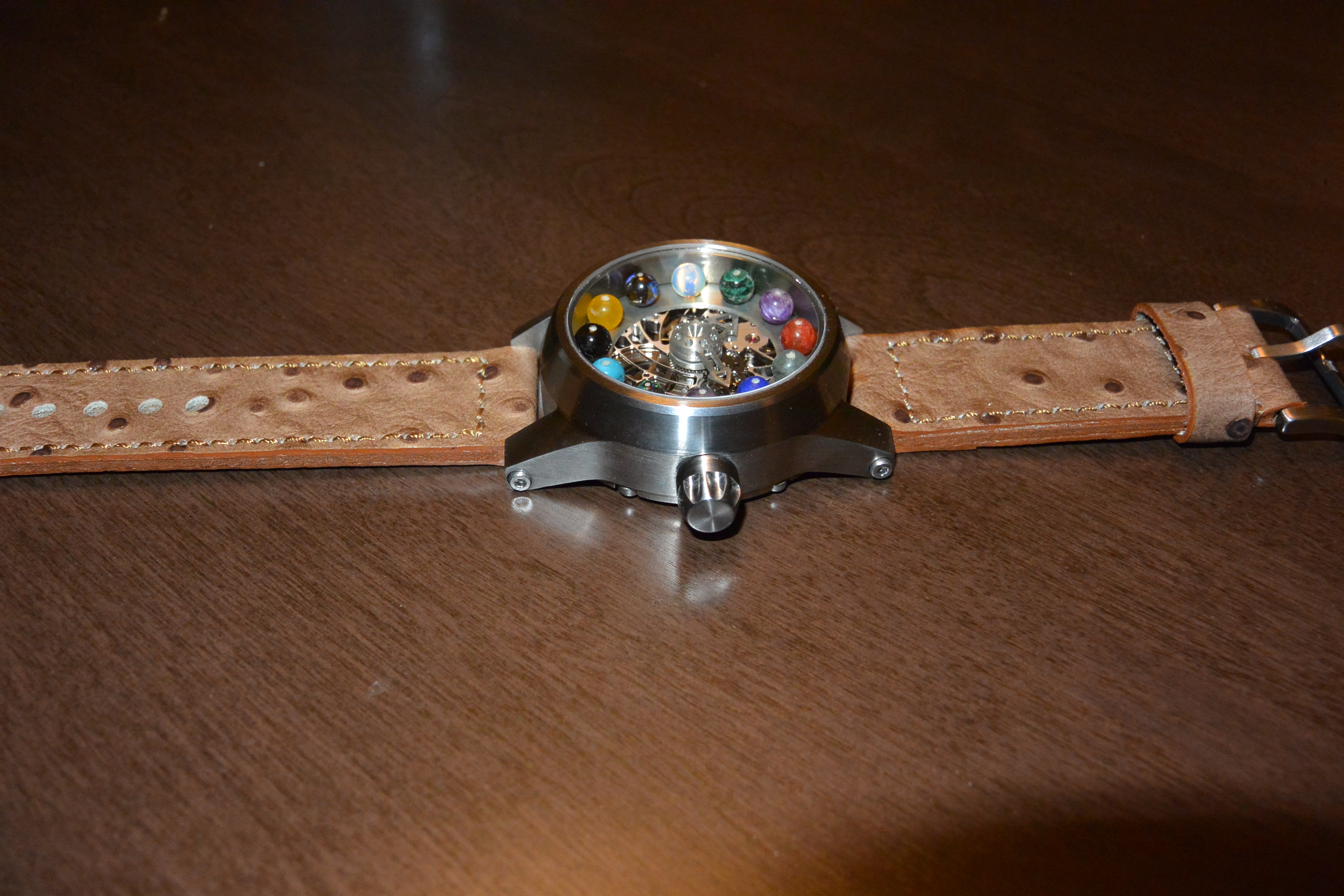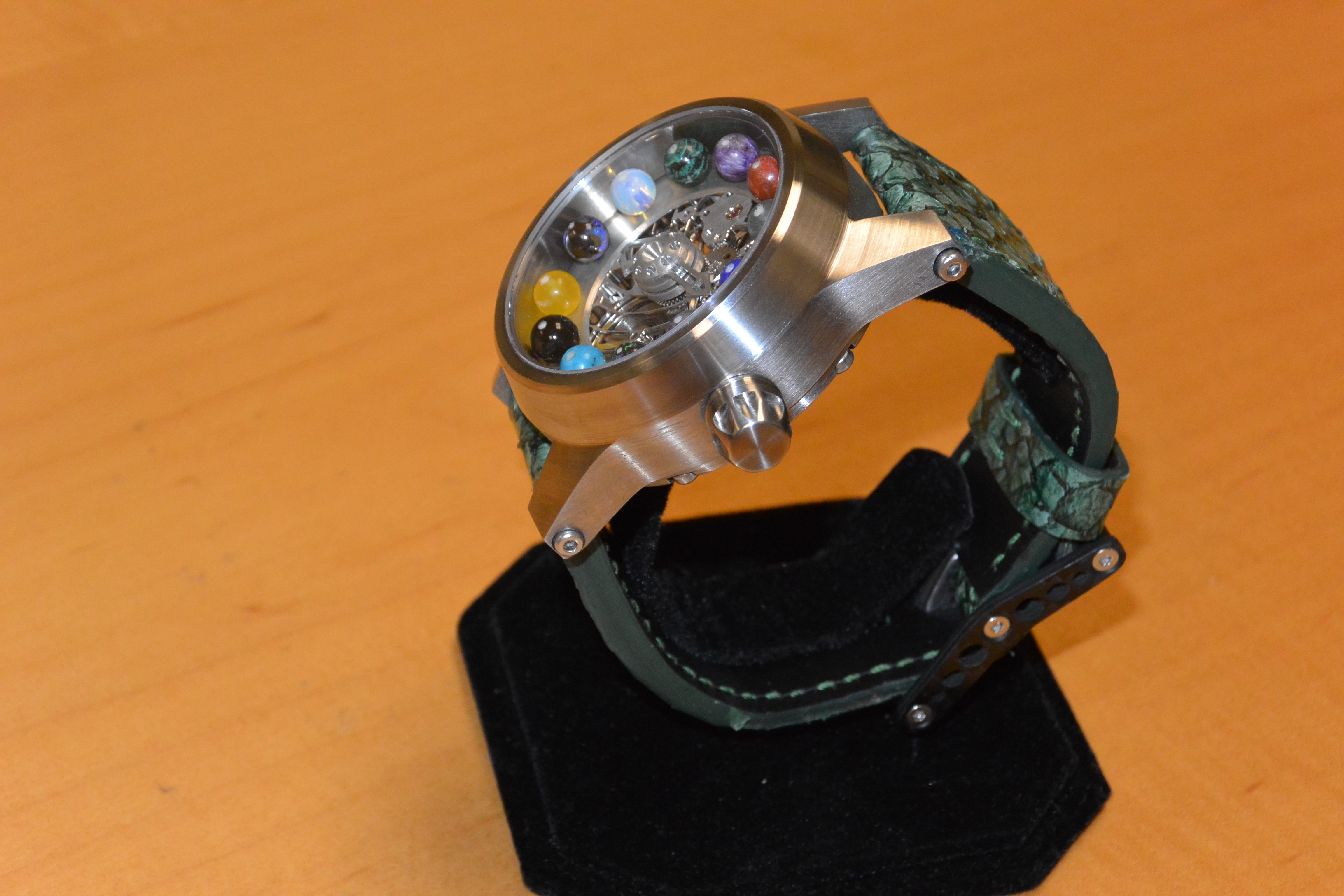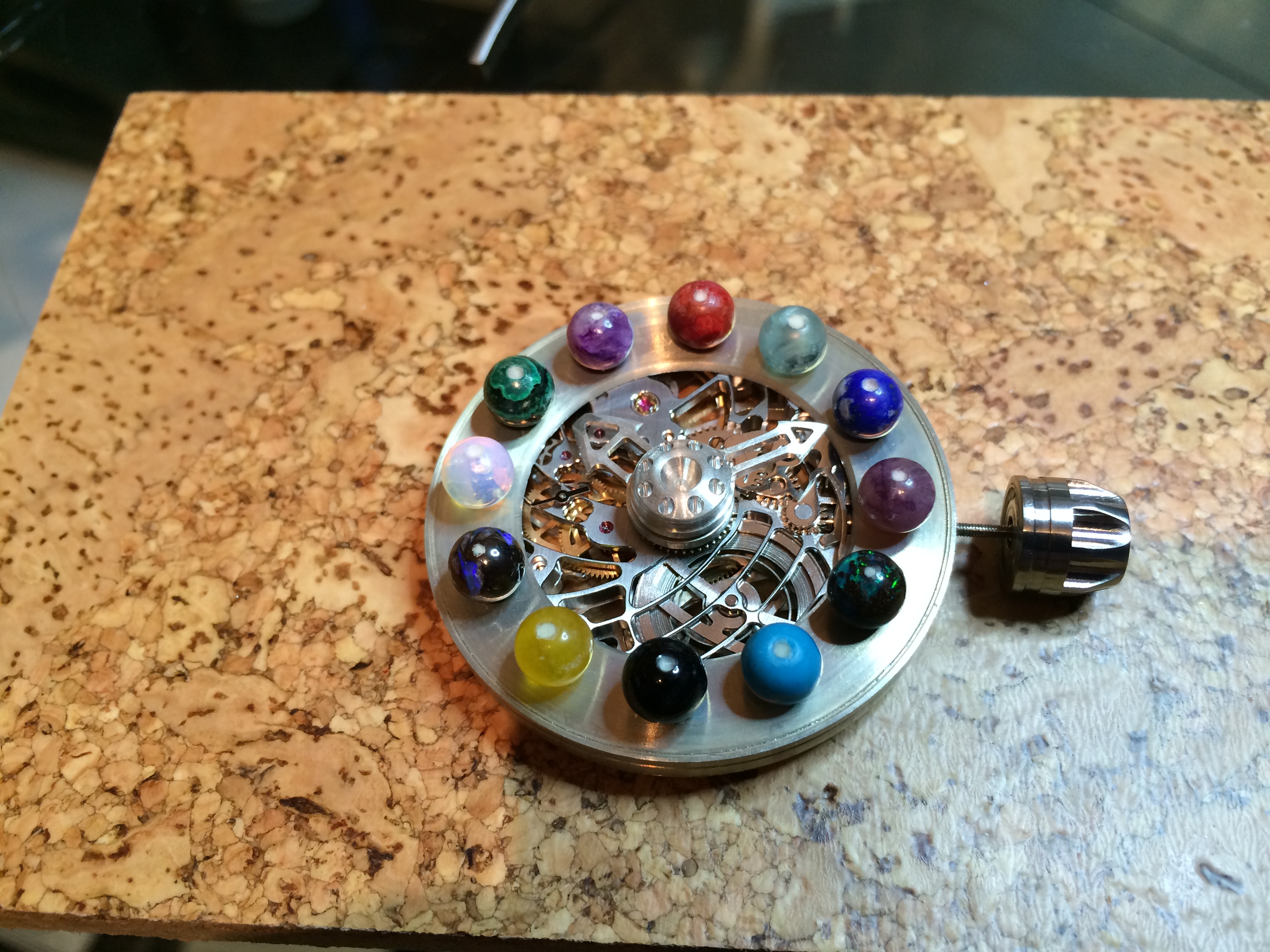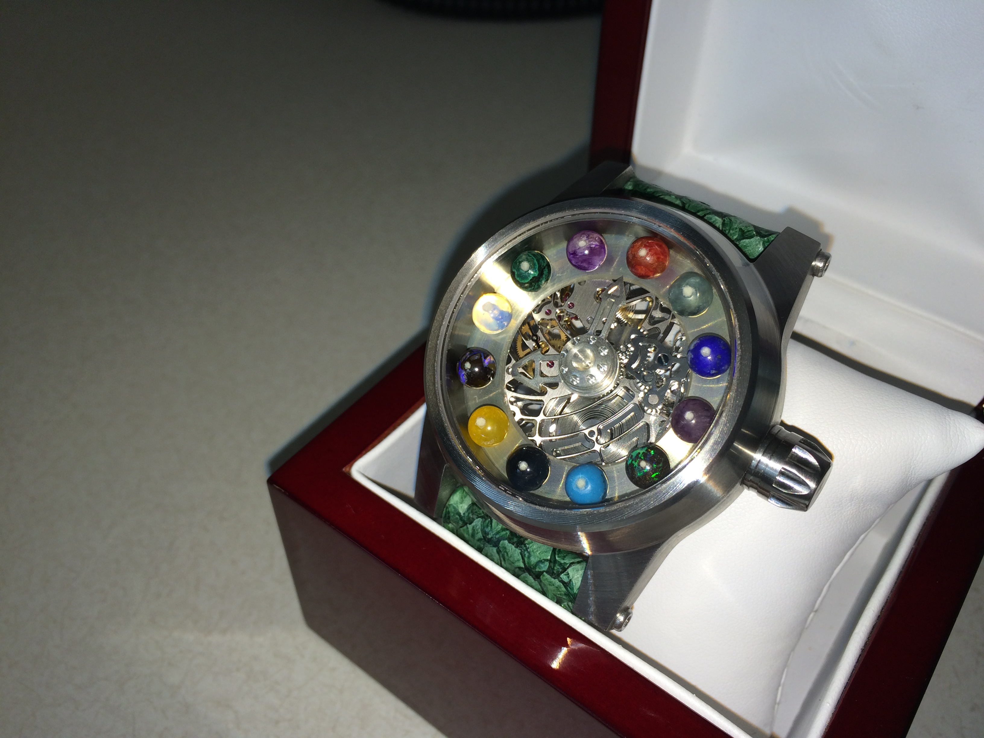 After hundreds of hours of work, the watch was completed with only 10 minutes to spare for the last possible FEDEX shipment. This watch is destined for a small but exclusive production run of very limited quantities. The gemstone selection will allow for infinite bespoke personalization so the customers, can have any gem or color combination that has meaning for them including diamonds/rubies/sapphires/etc. in custom color configurations. The watch is oversized so it will be best for those who have larger wrists or do not mind the obvious attention that this watch commands.