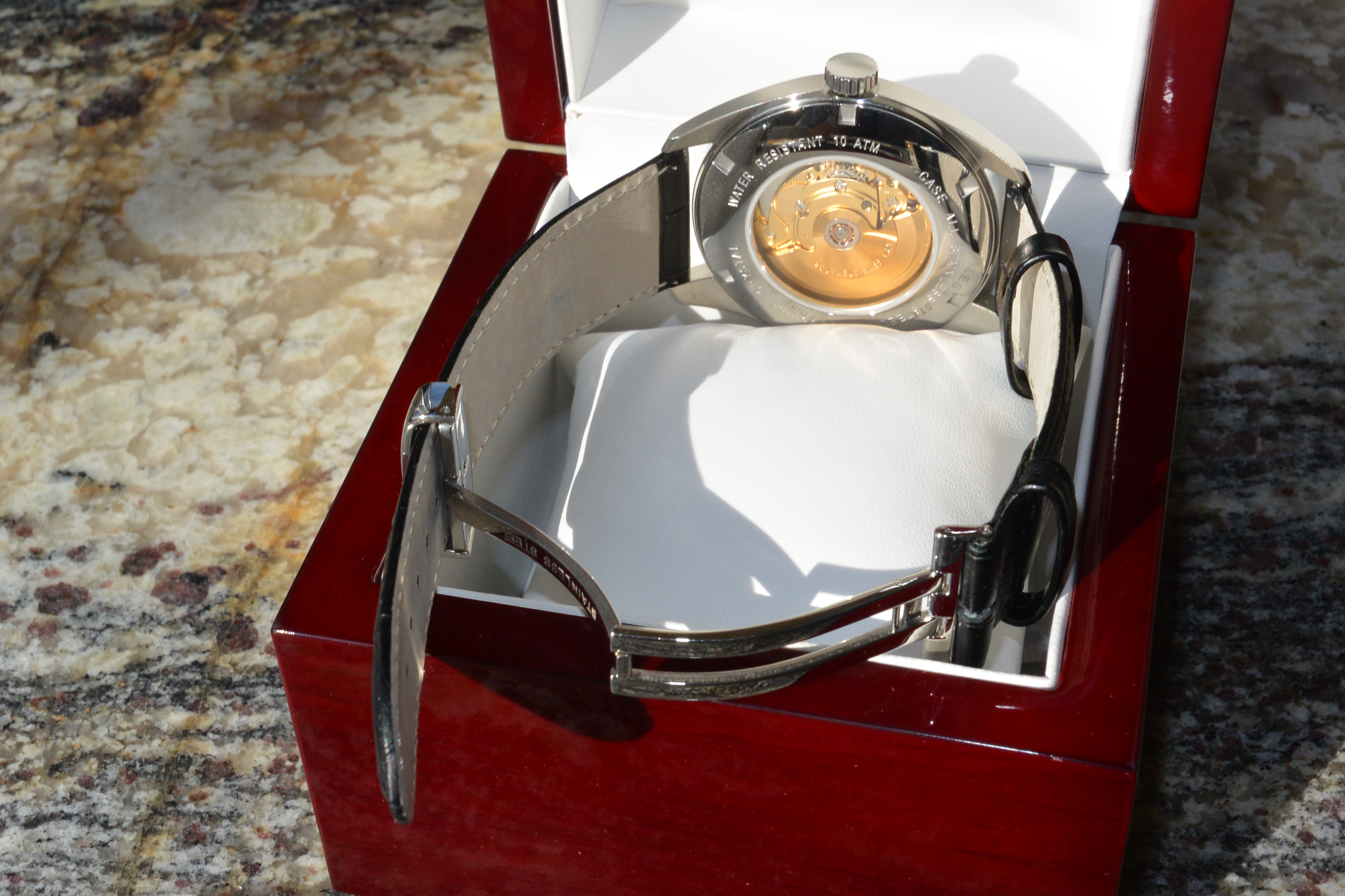 Retention: 22mm Swiss handmade leather band with deployant clasp