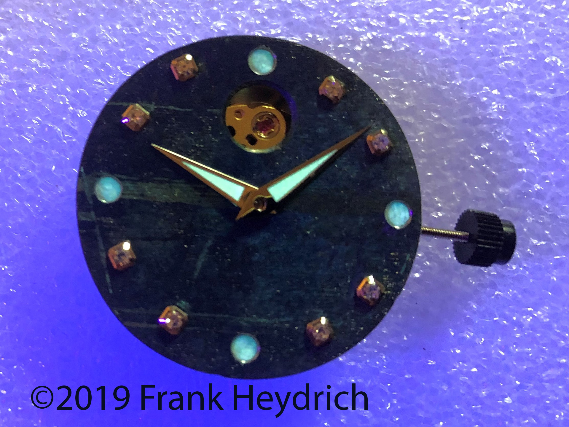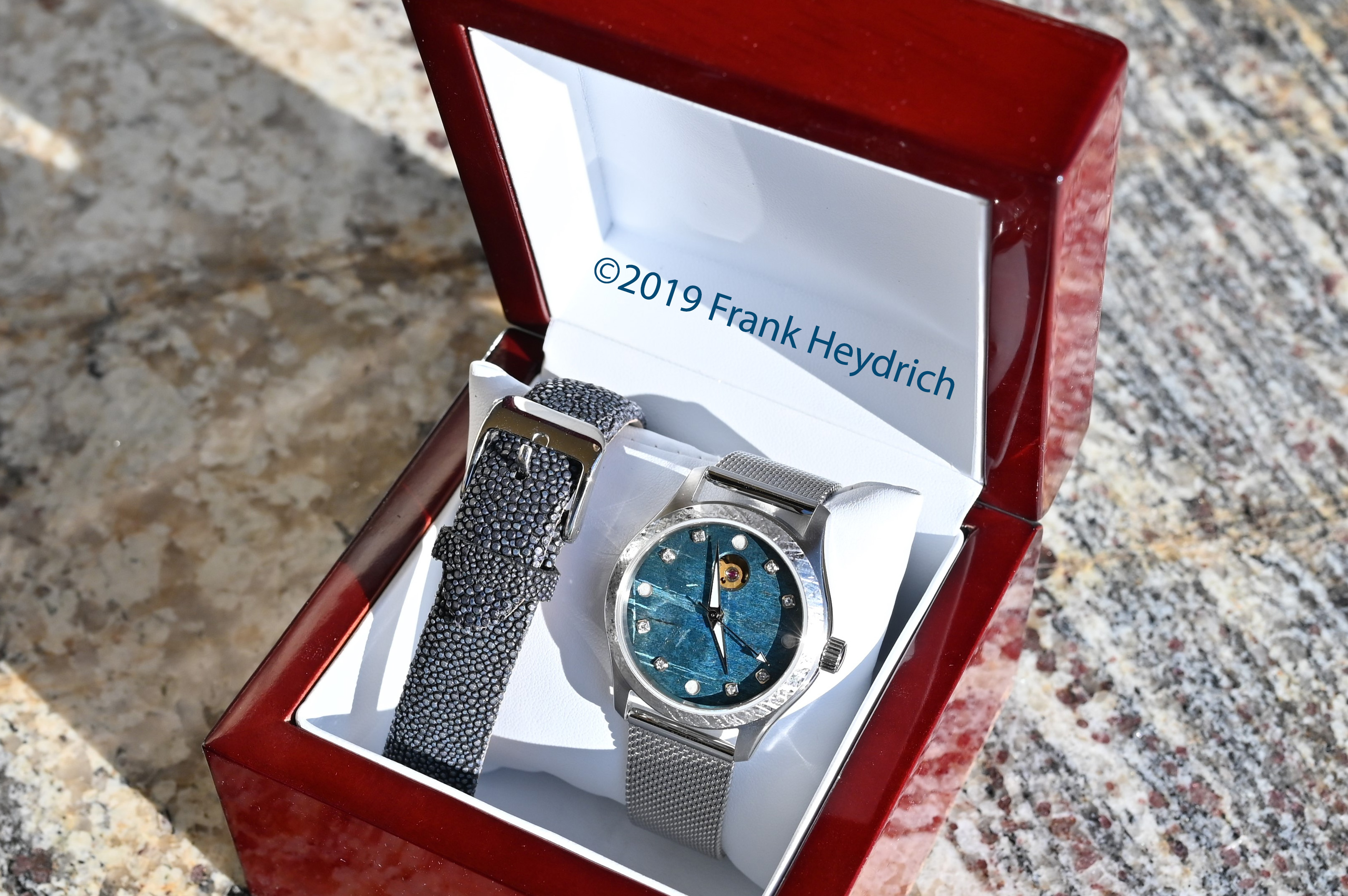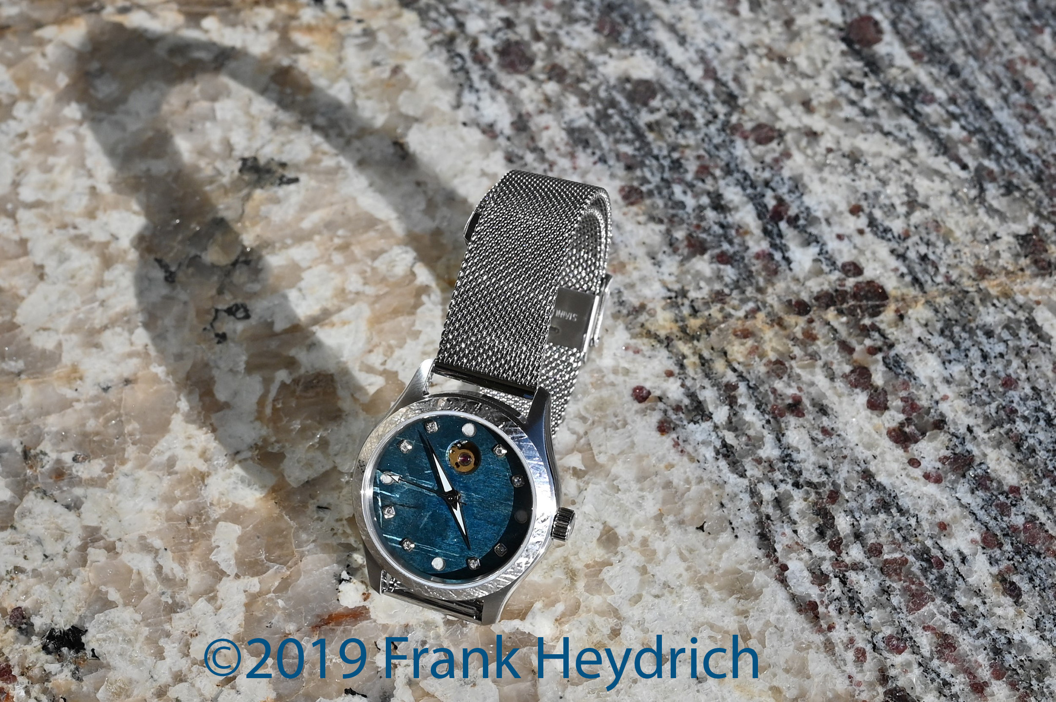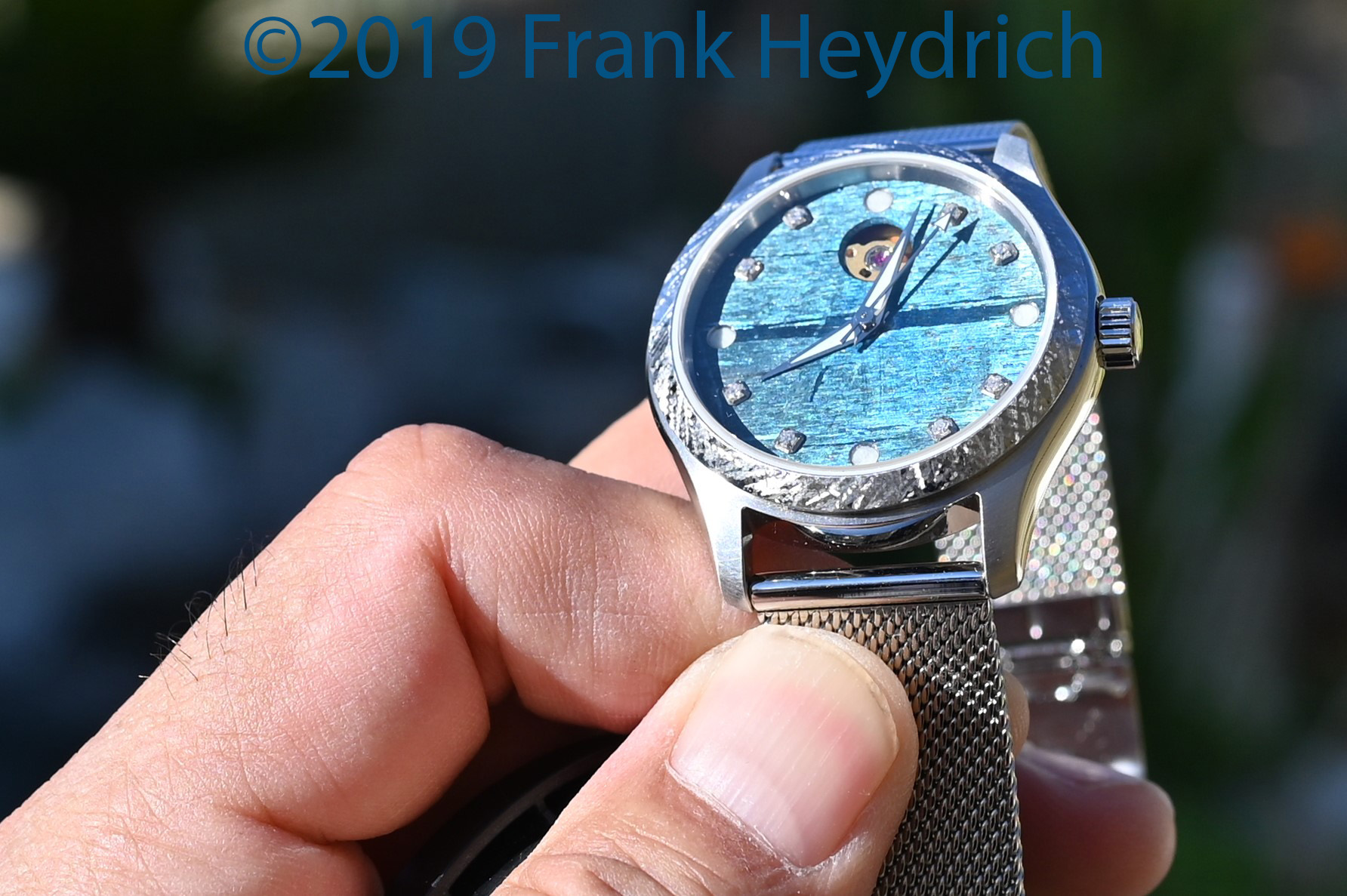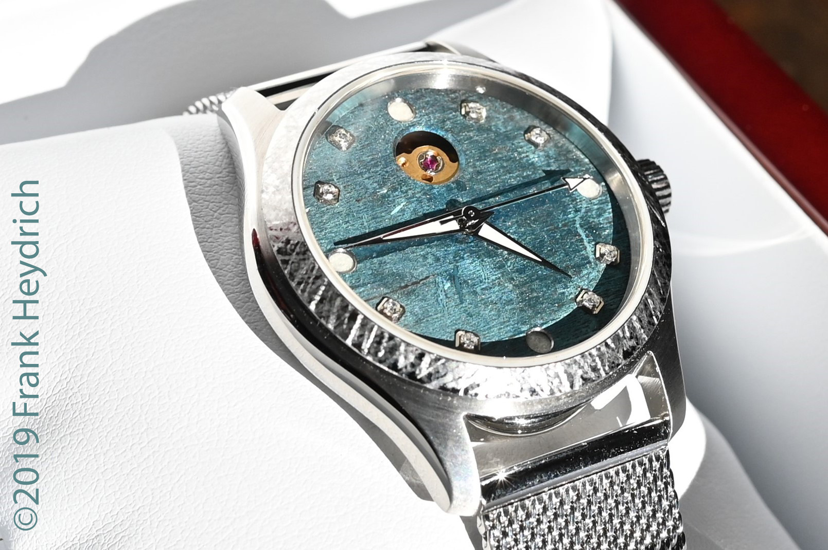 Dial: Gibeon iron meteorite blued with an open heart cutout and white diamond markers