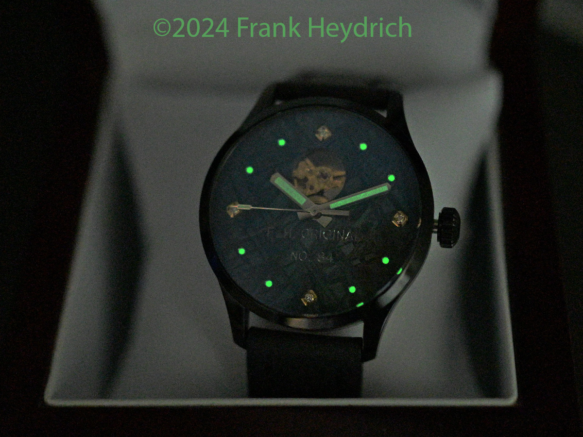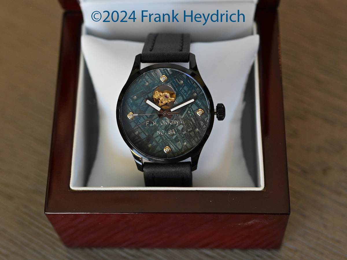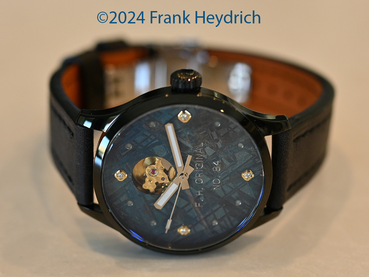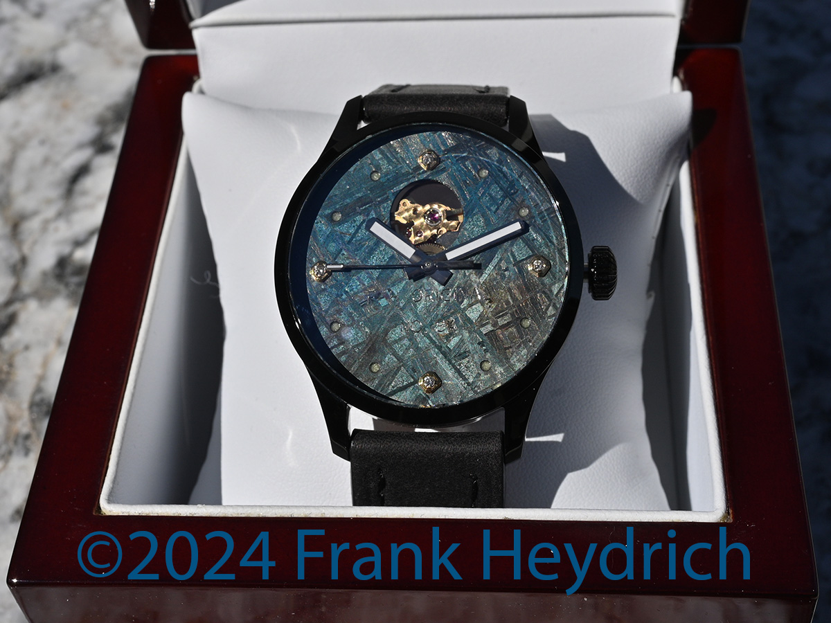 Dial: Gibeon iron meteorite blued with an open heart cutout and white diamond markers and superluminova dots